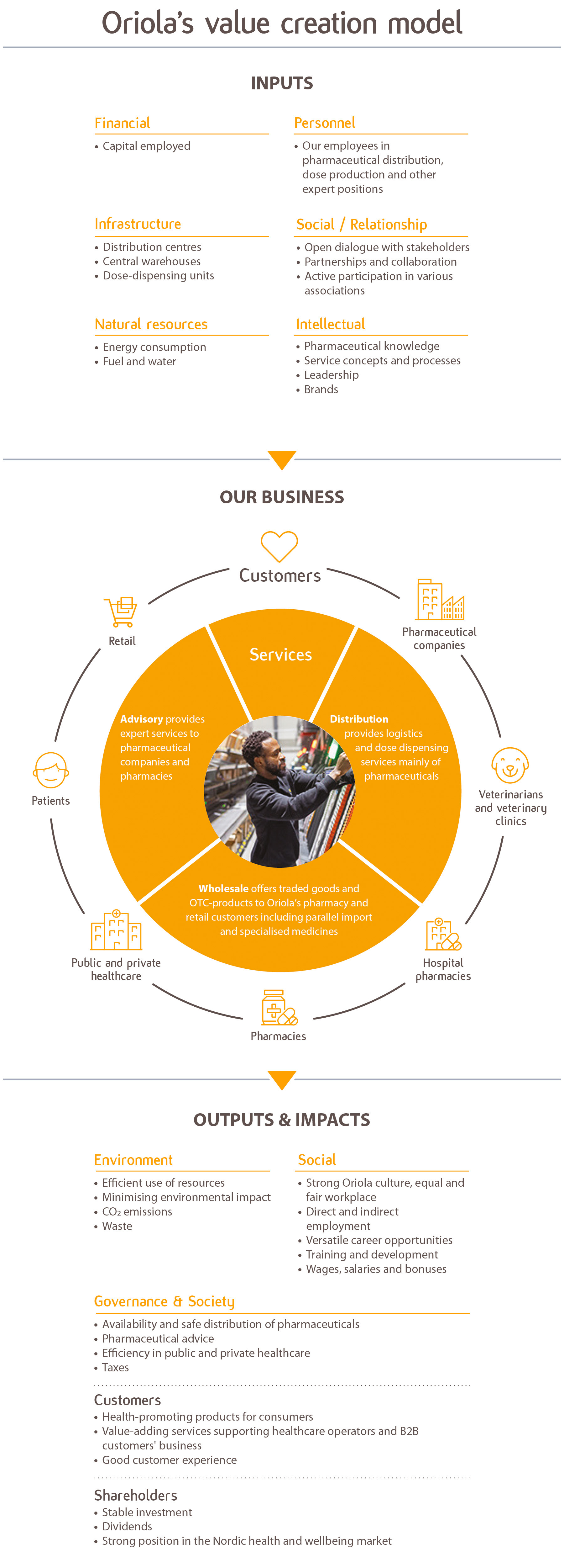 Our products and services create value for various stakeholders, from partners and employees to customers and shareholders. Oriola has a strong position in the Finnish and Swedish health and wellbeing markets. Our patient support and dose dispensing services promote the safe use of pharmaceuticals, and our extensive portfolio of health and wellbeing products supports health throughout life.